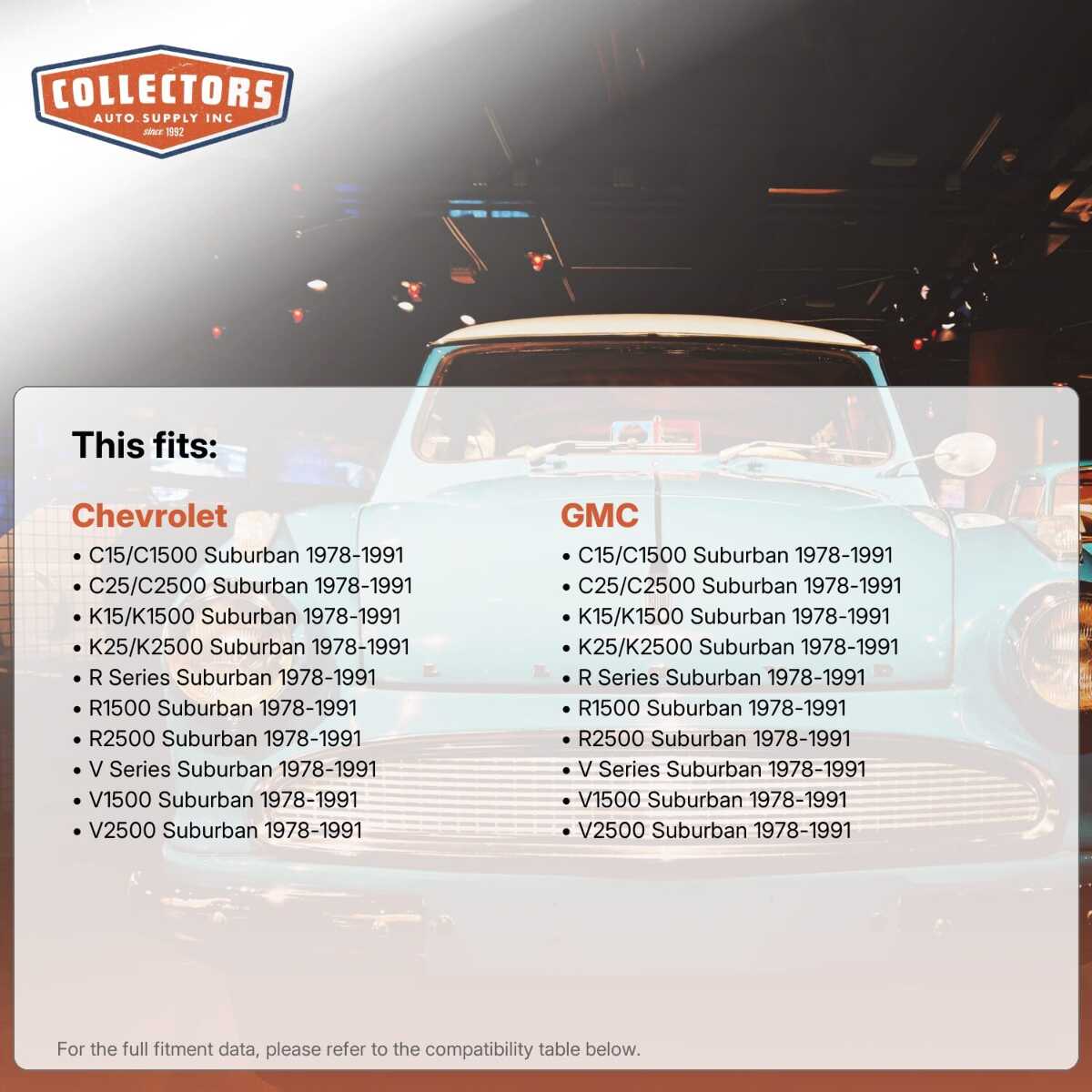 You can purchase this product directly from Collectors Auto Supply, where we specialize in classic car restoration parts and accessories. Finding the perfect part for your classic car can be difficult, and even frustrating. And let us be honest. What makes it worse is a general lack of customer love in the industry. That is why we are here, and that is why we are different. We are car people just like you, and we know what you need. And if we do not already know it, we're listening. So, contact us if you need help finding a part, or have an idea for how to improve our website, or anything else. Or if you want to do it the old-fashioned way, give us a call at 1 (800) 414-4462.