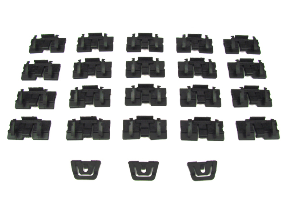 This clip secures the windshield trim in place, helping hold the molding tight against the glass and body.